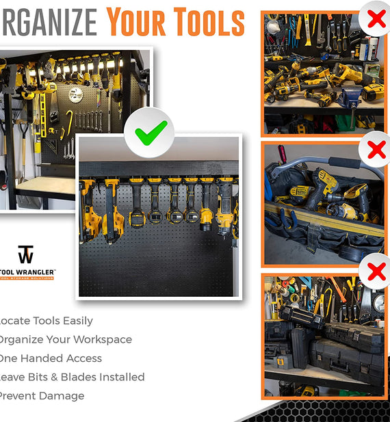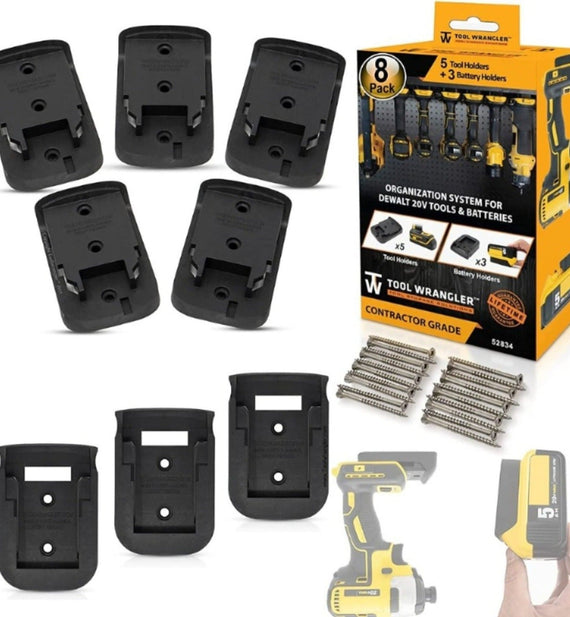 Organize and protect your Dewalt tools with Tool Wrangler Mounts. This 8 pack combo comes with 5 Black Tool Holders, 3 Black Battery Holders, mounting hardware, and instructions.